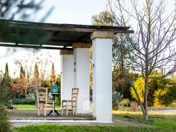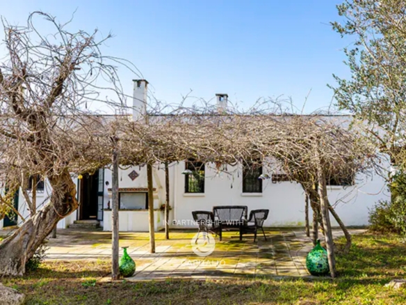A large gate introduces the property, immersed in the typical Mediterranean scrub, where the house is entirely developed on a single level, surrounded by shaded pergolas with reeds, perfectly integrated into the natural landscape.