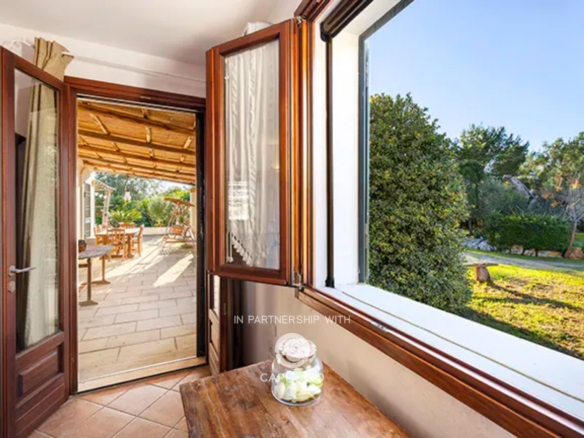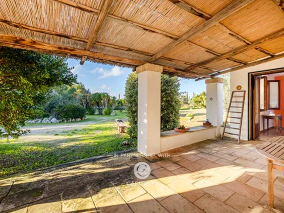 The interiors are organized around a spacious and bright living room with a fireplace, the heart of the living area, flanked by a fully equipped masonry kitchen, with a convenient utility room. The sleeping area hosts two double bedrooms, both with private bathrooms. Each room has direct access to the terrace that encompasses the entire house, creating a harmonious continuity between inside and outside.