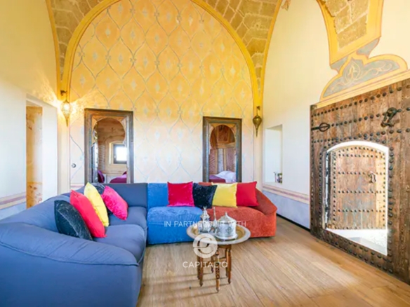 Beneath the living room, visible through glass slabs, emerge the ancient underground cisterns, an element of great historical value.