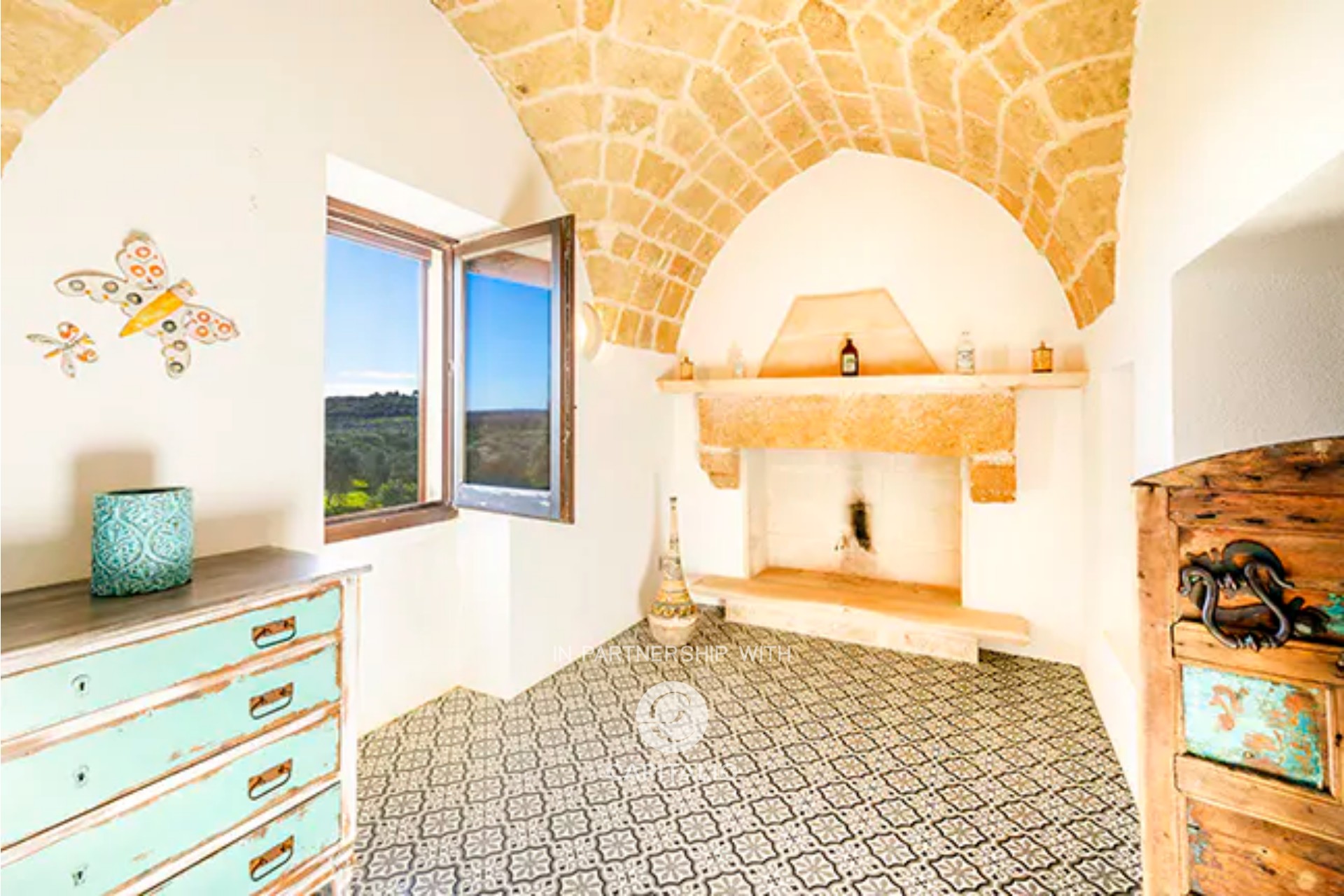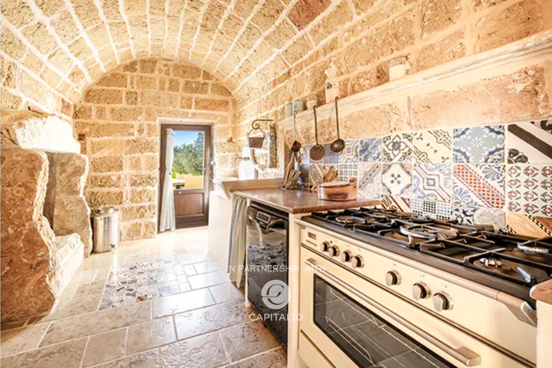 In the fully furnished kitchen, the ancient fireplace that was used for cooking and heating the environment and the original well have been preserved.