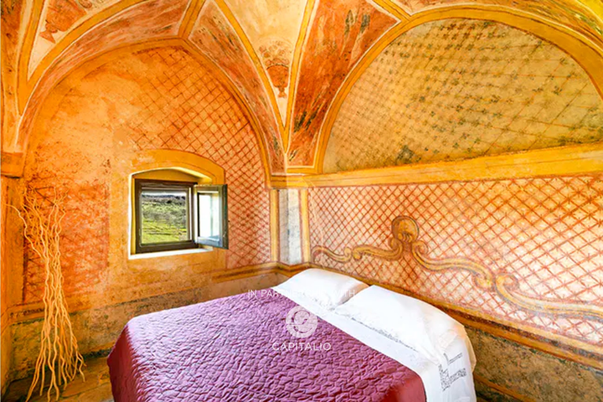 The sleeping area houses two fully frescoed bedrooms, brought to light during the renovation works, ancient 17th-century tiles, and a view of the olive grove.