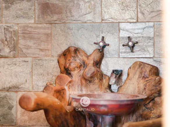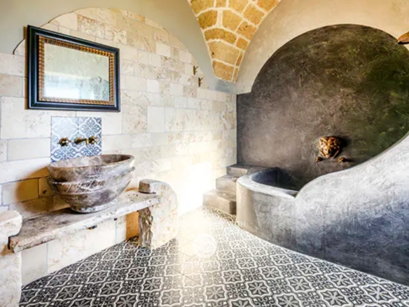 Serving the ground floor is a bathroom complete with a shower, finished with lava stone, Indian slate, brass, and olive wood finishes.