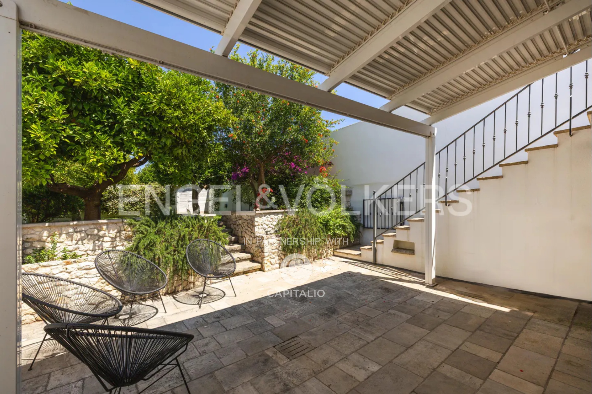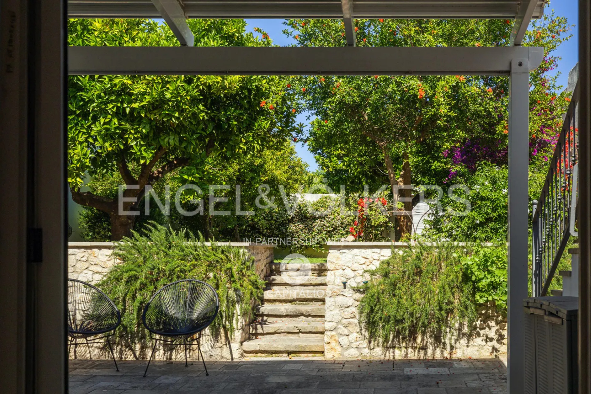 The heart of the house is the approximately 100 sq m internal garden: an oasis of peace where you can relax in the shade of the trees, organize summer dinners, or simply let yourself be enveloped by the silence and nature.