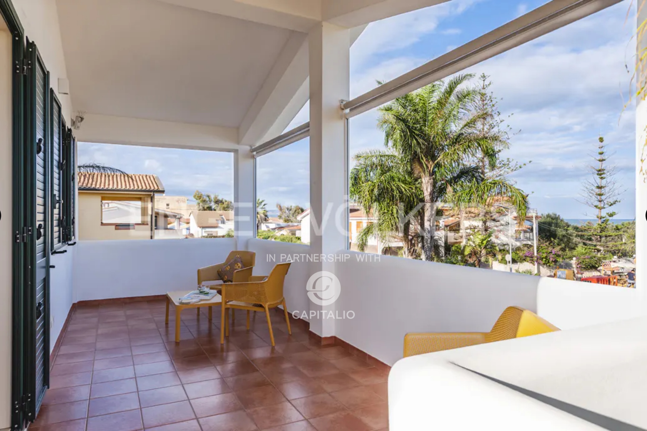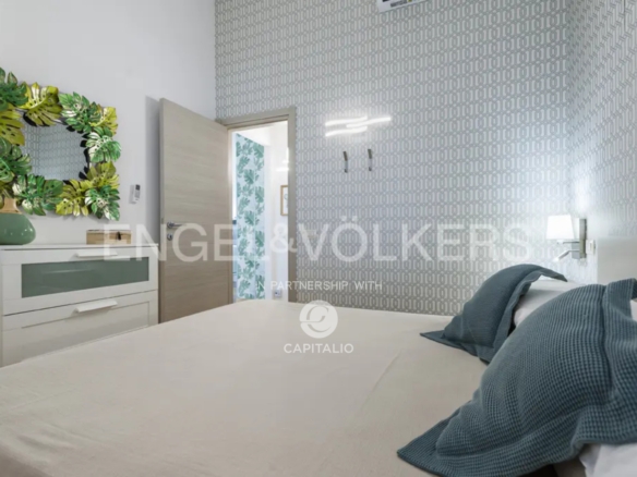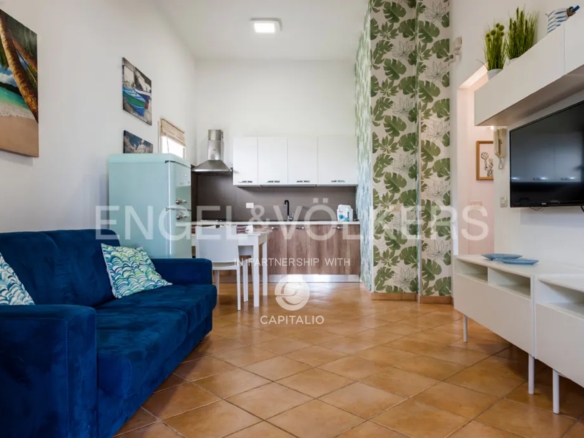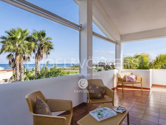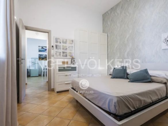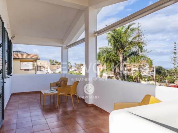The Calantha apartment is about 110 sqm and belongs to the exclusive Anny Residence, which is located a few steps from the beautiful beach of San Lorenzo. This lovely sea view apartment has been recently renovated. It has modern style furniture with a minimal design. The flat occupies the first floor and consists of a large living-dining room with sofa bed, cooking area, two bedrooms and two bathrooms, one of which is located between the two bedrooms and the other on the ground floor, that you can access via the external staircase. This staircase also leads from the private garden directly to a spacious veranda with pleasant sea view, to enjoy the coolness of the evening, while relaxing at home. The flat lends itself to be used both as an investment in the circuit of holiday homes and for personal use, representing the optimal solution for those who are looking for a quiet place, not far from the main local touristic attractions.