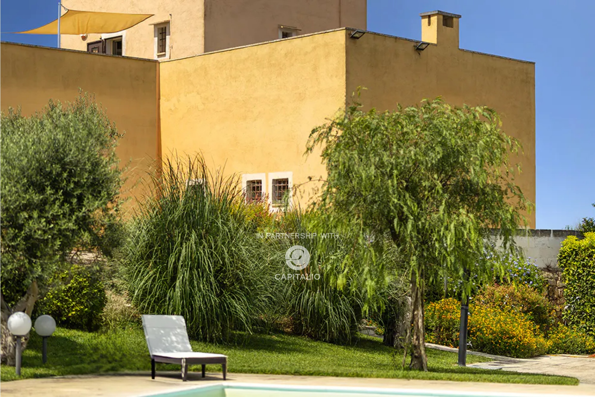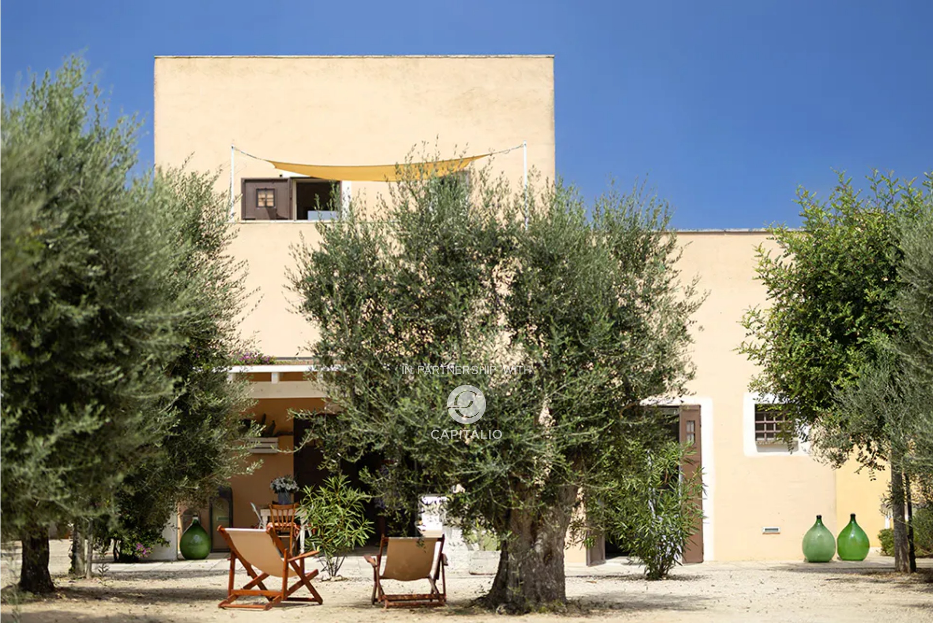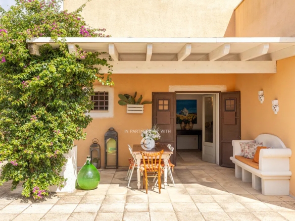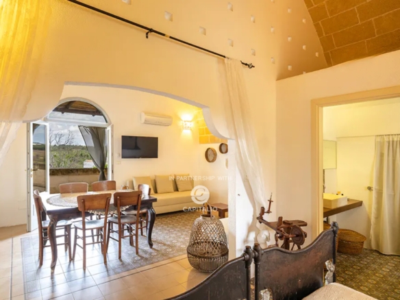 At the end of a gravel driveway, you access the Masseria, where a double bedroom, bathroom, living room, and kitchen develop, each space opening onto terraces, pergolas, or garden.