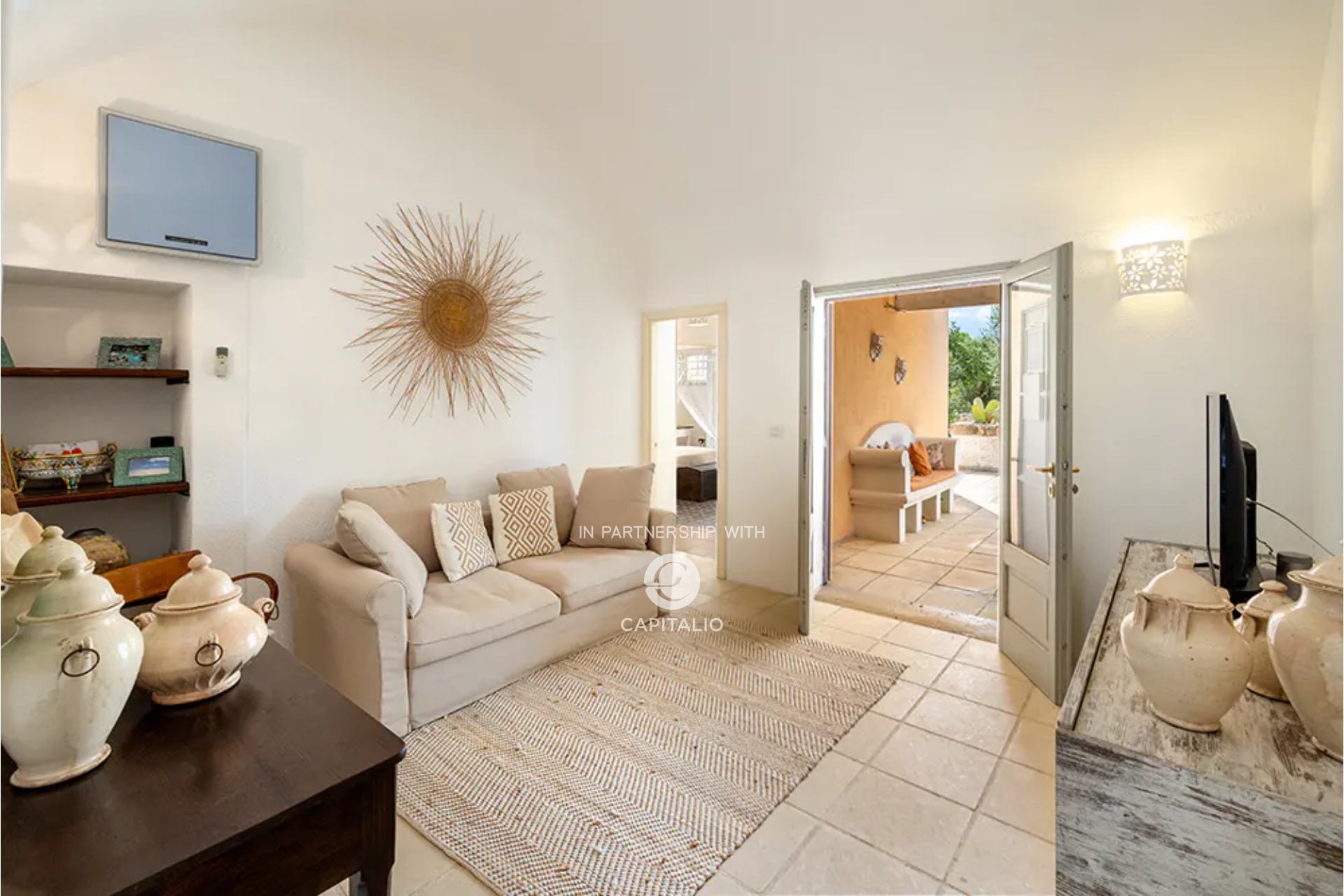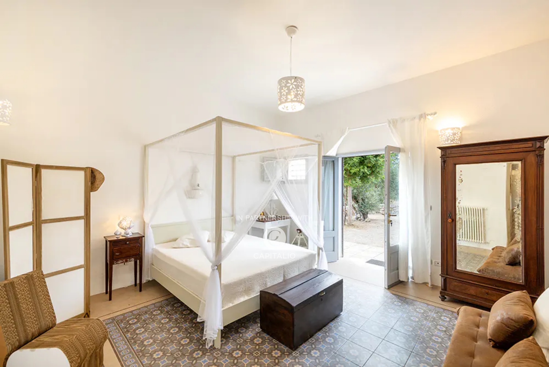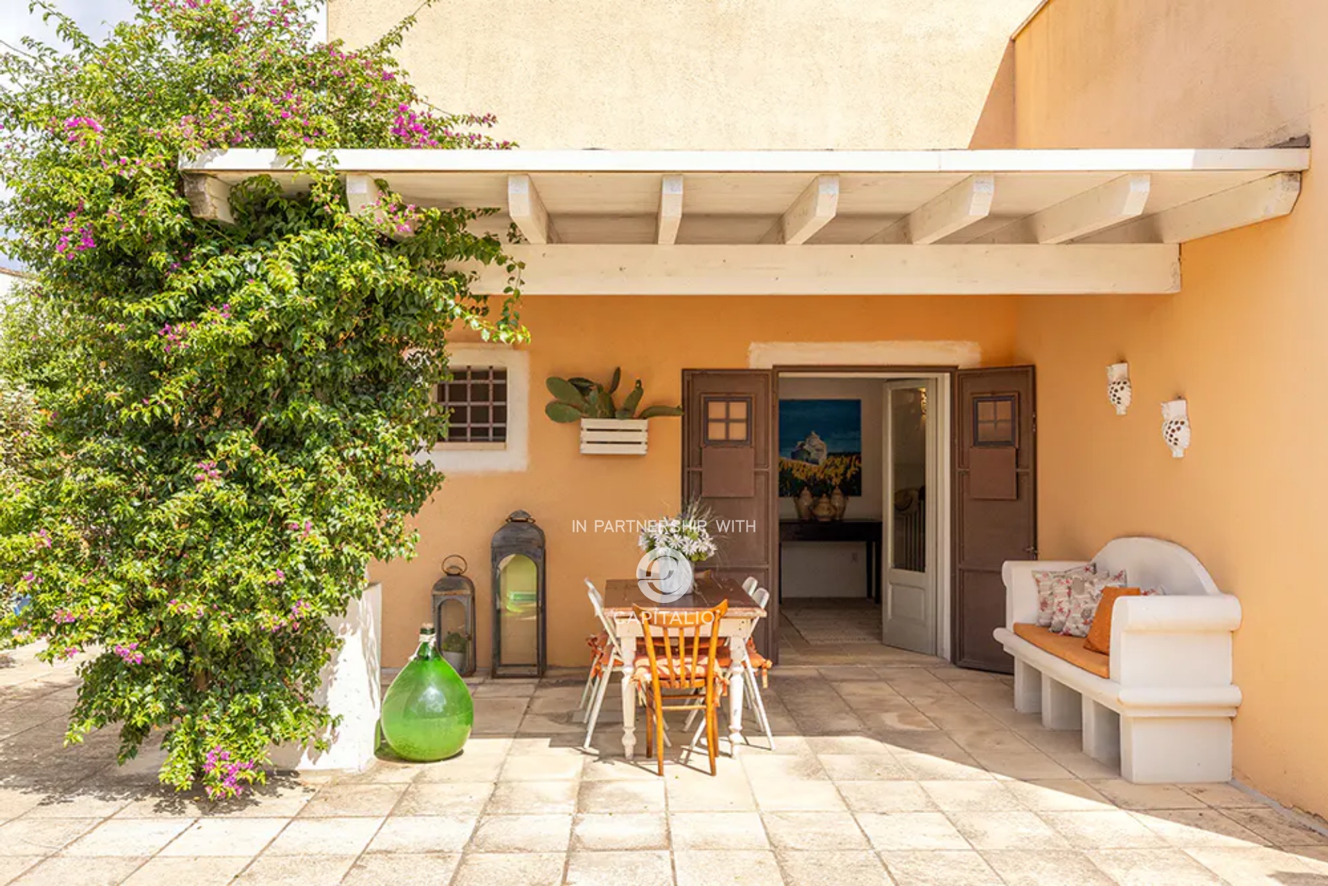 At the end of a gravel driveway, you access the Masseria, where a double bedroom, bathroom, living room, and kitchen develop, each space opening onto terraces, pergolas, or garden.