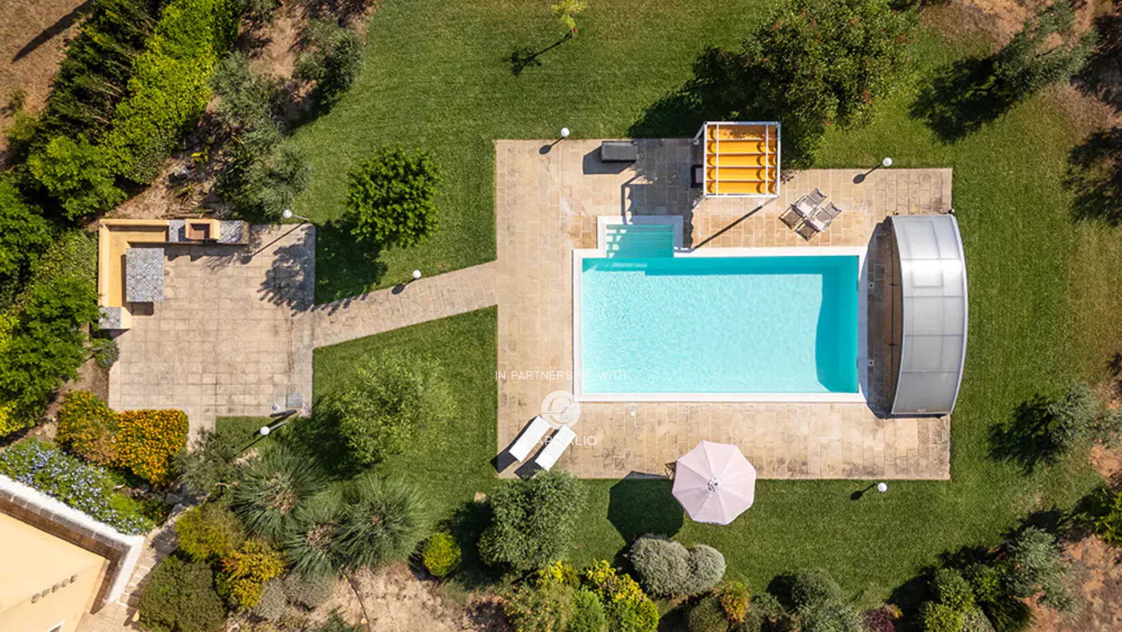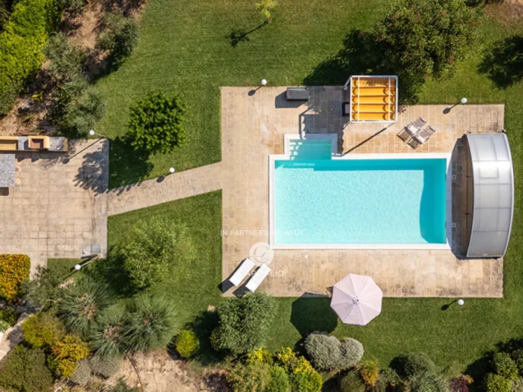 The property, surrounded by a large wooded garden of 5000 sqm, offers absolute privacy and welcoming outdoor spaces; natural shaded areas, panoramic terraces, a pool with Roman steps, solarium, and ideal spaces for outdoor lunches and dinners.