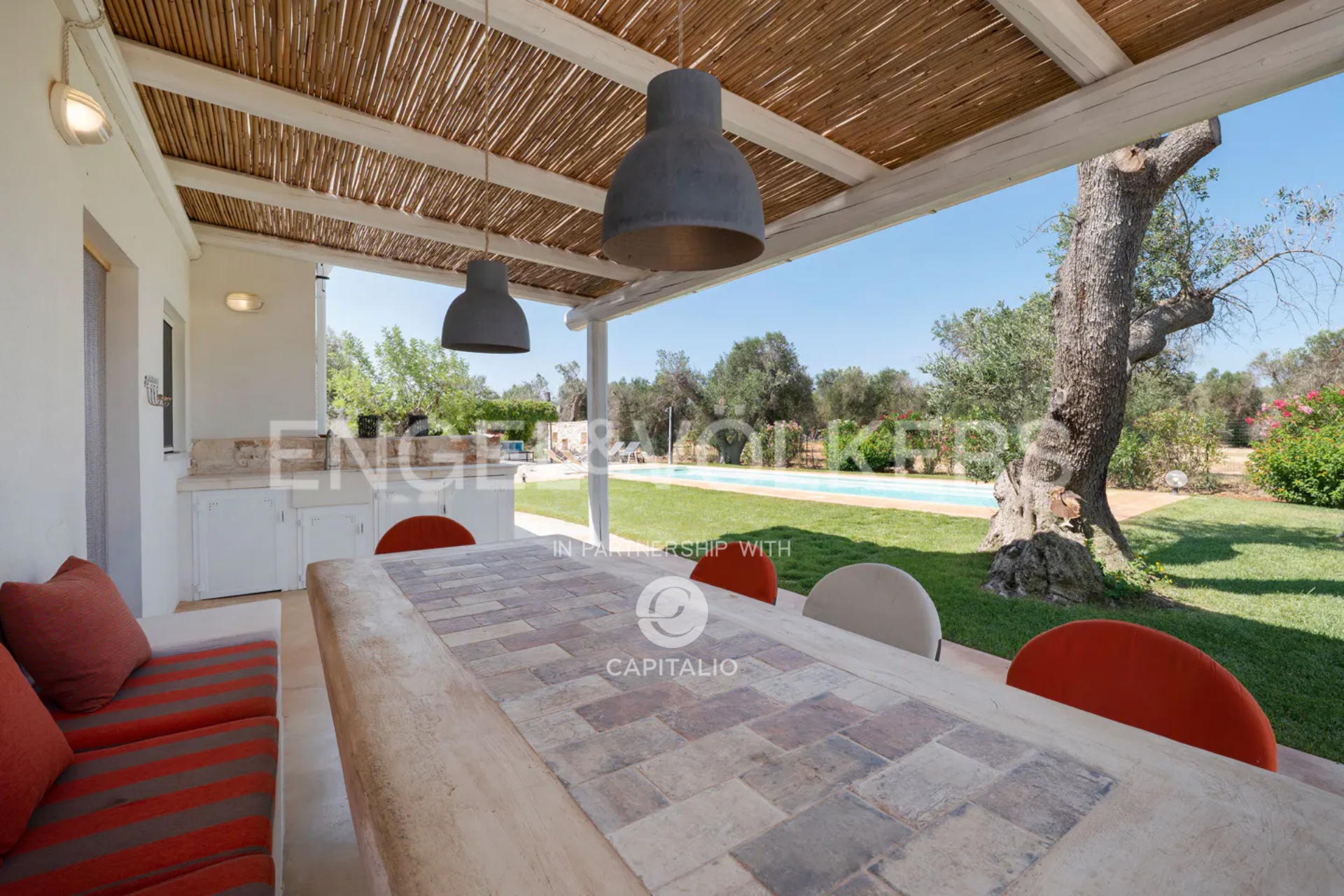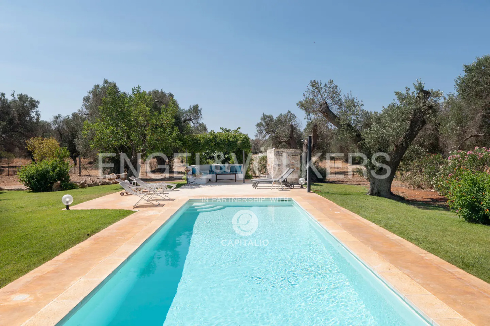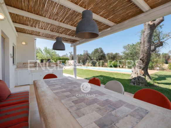 Outside, there are two large living areas covered by pergolas where you can enjoy summer lunches and dinners, a modern swimming pool with a very effective salt electrolysis water disinfection method that does not use chemicals. There is also a barbecue area, a well-kept lawn, and a field of centuries-old olive trees that enliven the park and convey a special positive energy. The property is completely fenced, with an elegant driveway and a space dedicated to cars.