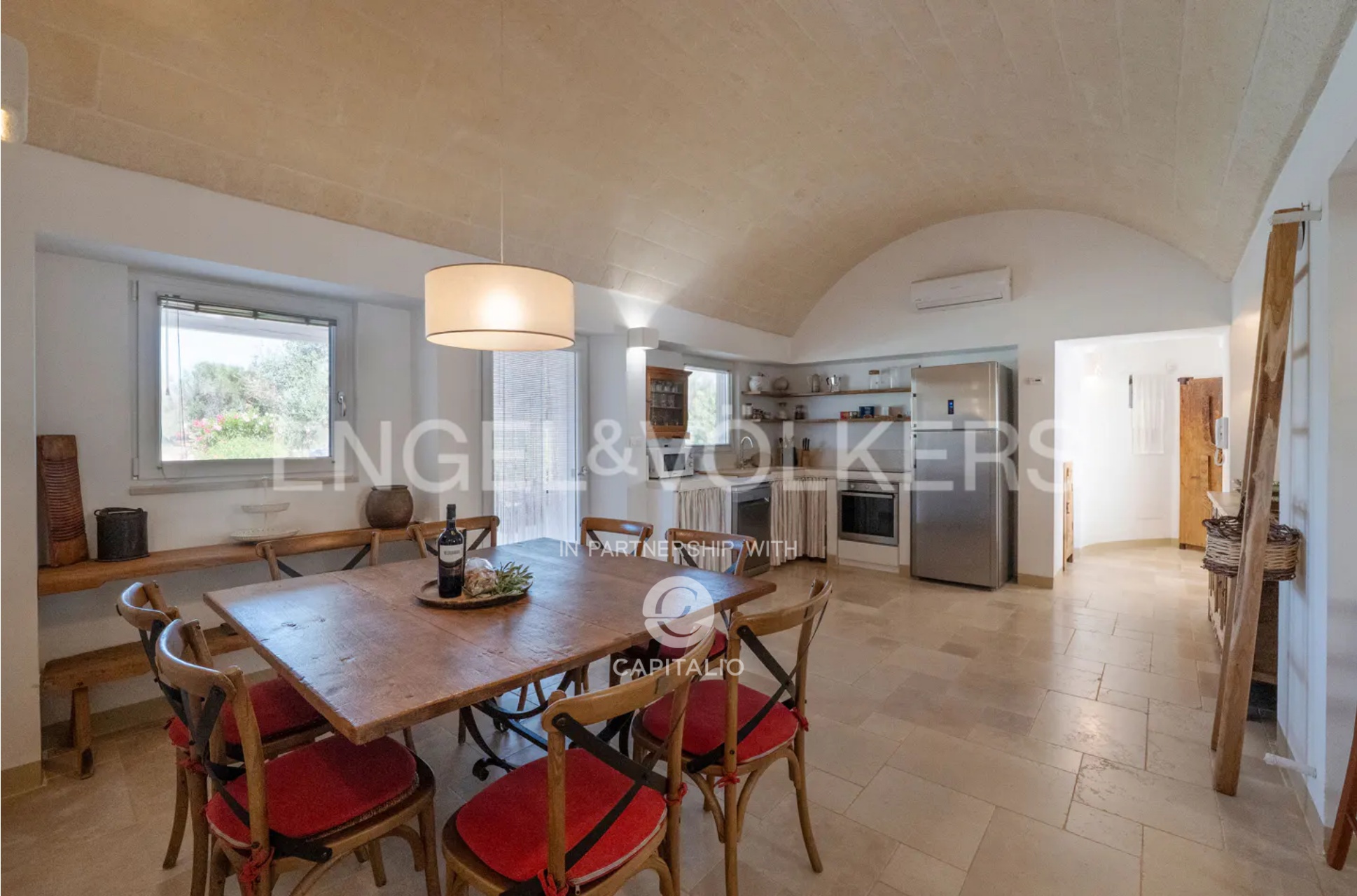 Inside, there is a large living room with a sitting area, dining area, and kitchenette, two bedrooms with two bathrooms in the newer part, and two more bedrooms with a bathroom in the trullo.