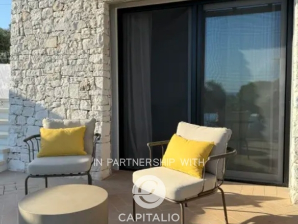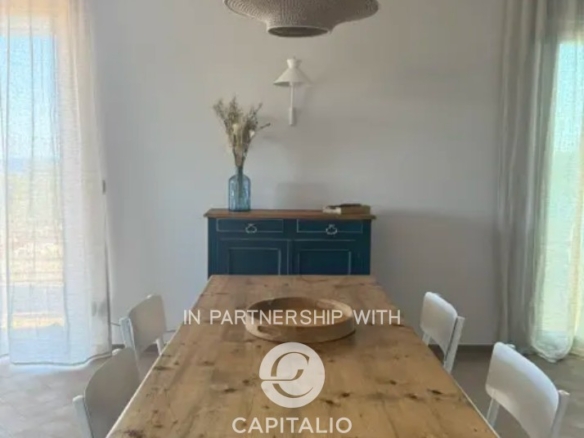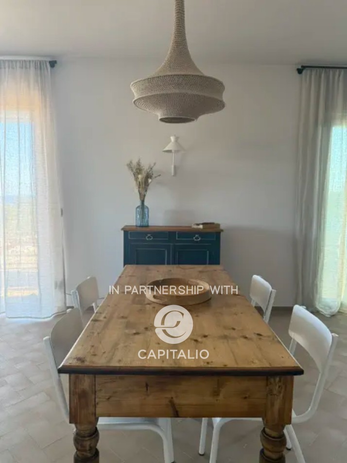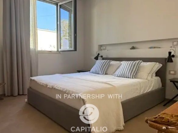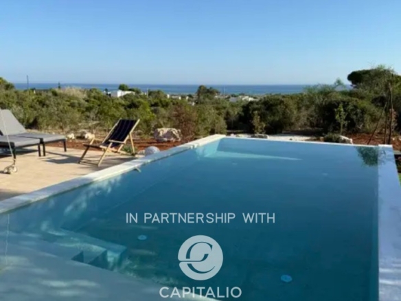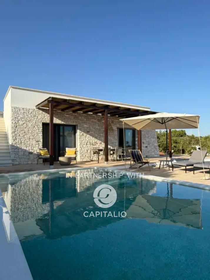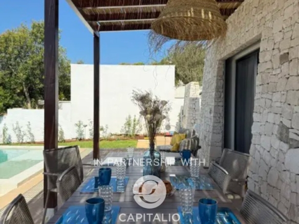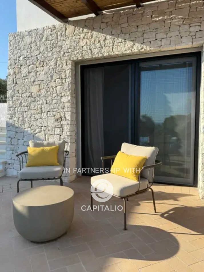 Villa Corten is an example of modern design, in harmony with its surroundings. In a dominant and tranquil position, in Torre Pali of Salve, it extends over almost 100 square meters of surface, on a plot of 2500 square meters and enjoys a spectacular view of the sea and the beaches of Pescoluse, which are less than a kilometer away. It was completed in 2024 with high-quality finishes, including external paving in Lecce stone and walls in natural stone, creating a warm and refined atmosphere, perfectly in tune with the landscape. The interior is characterized by spacious, bright areas, with a convertible living room that can adapt to various needs. The open-space kitchen is well integrated with the living room, creating a fluid and welcoming environment. It has a double bedroom and two bathrooms, one of which is en suite. The sea view at sunset can also be enjoyed from the 30 sqm infinity pool, located in a privileged position that seems to blend with the horizon, offering a unique relaxation experience. The corten effect of the gate, fixtures, and pergola seems extracted from the red of the garden’s earth, in a harmony of colors, enhanced by the white tones of walls and stones. The outdoor area is ideal for moments of outdoor leisure, which can continue on the terrace, where the view becomes iconic. From the sunset over the sea onward, the colors become magnificent, thanks to the lighting that enhances the exterior. The fixtures are thermal break, and the fittings are iron. Heating and cooling system with heat pump. Cistern for running water storage and sewage with sub-irrigation system. Solar panel for hot water. It is the perfect refuge for those seeking an exclusive, new, and ready-to-use residence, immersed in rurality, with a panoramic view.